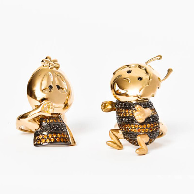 Best Friends Honey and Bunny, a combination of Glossy Gold and Matt, with Black Diamonds and Citrine 18ct gold 0.44 black Diamond + 0.25 Citrine 18ct Gold 0.82 Black Diamond + 0.95 Citrine.